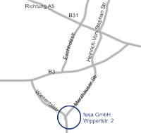 Mit der Straßenbahnlinie 3 (Munzinger Straße — Hauptbahnhof — Vauban und zurück) können Sie fast bis vor unsere Haustür gelangen. Dazu müssen Sie nur an der Haltestelle Peter-Thumb-Straße aussteigen und in Richtung Solarsiedlung/Vauban laufen. Nach ca. 100 m geht die Wippertstraße links von der Merzhauserstraße ab. Direkt an der Ecke Merzhauser Straße/Wippertstraße/Wiesentalstraße liegt das Technologie Transfer Zentrum Freiburg (TZF) in dem die fesa GmbH untergebracht ist.